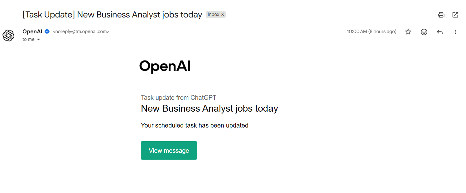 Once created, the task runs automatically every day and provides regular job updates inside ChatGPT.